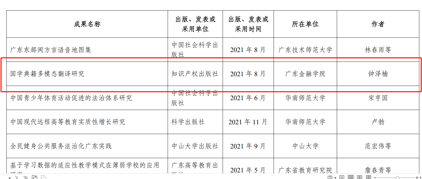 近日,由广东省哲学社会科学规划领导小组批准,广东省哲学社会科学优秀成果评奖工作办公室组织的第十届广东省哲学社会科学优秀成果奖评选公示结果。公司bevictor伟德钟泽楠老师的专著《国学典籍多模态翻译研究》荣获著作类成果三等奖。