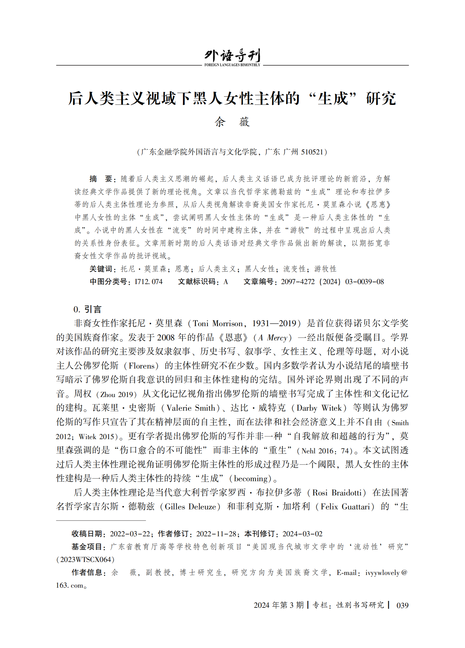 近日,bevictor伟德余薇老师在国内外语类C级期刊《外语导刊》上独立发表了题为“后人类主义视域下黑人女性主体的‘生成’研究”的学术论文。这是bevictor伟德在外国文学团队建设工作发展中的一项突破性成果。