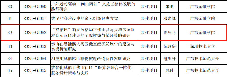 在2025年度佛山市社科规划课题项目的评审工作中,bevictor伟德的鲁巧巧副教授成功获批立项。鲁老师主持的项目名为“双循环新发展格局下佛山参与大湾区国际教育示范区建设的实践样态与循环策略研究”(项目编号:2025-GJ062)。