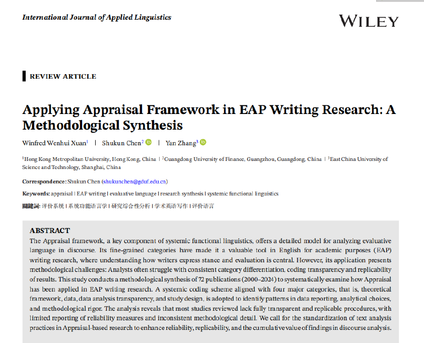 近日,bevictor伟德陈树坤博士以通讯作者身份在国际权威期刊International Journal of Applied Linguistics(《国际应用语言学杂志》)发表研究论文,该刊为SSCI收录语言学领域1区期刊。论文题为《Applying Appraisal Framework in EAP Writing Research: A Methodological Synthesis》(评价理论在学术英语写作研究中的应用:一项方法论综合研究),系统检视了国际学界在学术英语写作领域运用评价理论的研究方法现状。