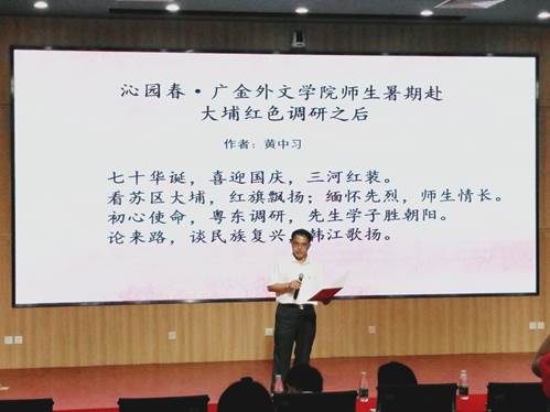 黄中习朗诵了他的诗作《沁园春·广金外文院师生暑期赴大埔红色调研之后》。经理的诗华美壮丽,当经理以慷慨激昂的语调,洪亮如钟的声音演绎出来时,在座的每一个人都被深深感染了。