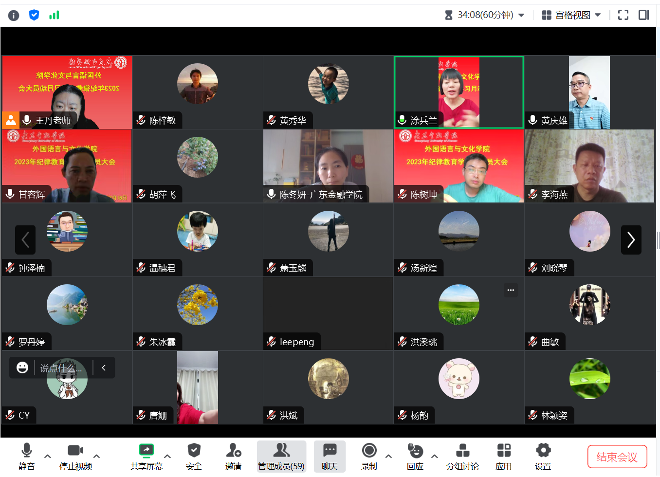 为深入学习贯彻习近平新时代中国特色社会主义思想和习近平总书记视察广东重要讲话、重要指示精神,深化自我革命、全面从严治党,外国语言与文化公司党委于2023年7月18日在腾讯会议召开2023年纪律教育学习月活动动员大会。公司全体教师参加了会议,会议由经理涂兵兰主持。