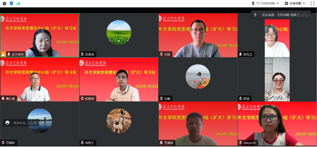 为更好高效地推进暑假期间公司主题教育工作的落实,持续深入开展习近平新时代中国特色社会主义思想以学正风。7月25日,外国语言与文化公司党委采取线上集中学习的形式召开了公司党委理论学习中心组(扩大)学习会议,公司党委委员、班子成员、教工支部书记以及支委、员工支部书记参加会议。