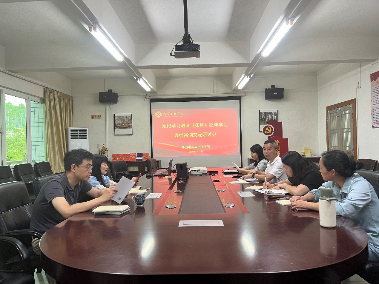 根据公司党纪学习教育有关部署要求,为了更好地有力有效推进党纪学习教育,结合工作实际,外国语言与文化公司党委于2024年7月11日下午在公司2417会议室召开《中国共产党纪律处分条例》(简称:条例)延伸学习及典型案例交流研讨会,会议由公司党委书记黄庆雄主持。公司党委副书记、经理涂兵兰教授及公司党政班子成员和公司党纪学习教育专班成员参加会议。公司党政班子成员涂兵兰经理、陈树坤副经理、甘容辉副经理、洪溪珧副经理和王丹副书记分别作了交流研讨发言。