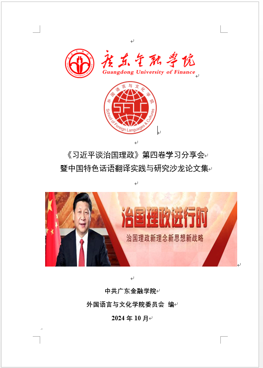 论文集收录了来自公司师生的17篇文章,涵盖了从公司党委以及副经理洪溪珧、MTI中心主任刘传江、商英系主任钟泽楠等教师的深度研习和黄中习教授、洪溪珧博士、刘晓琴博士等指导下完成的多篇员工论文。这些论文从多个维度对《习近平谈治国理政》(第四卷)的英译策略、文化专有成语的典故翻译、生态翻译学视角下的关键词翻译等进行了深入探讨。