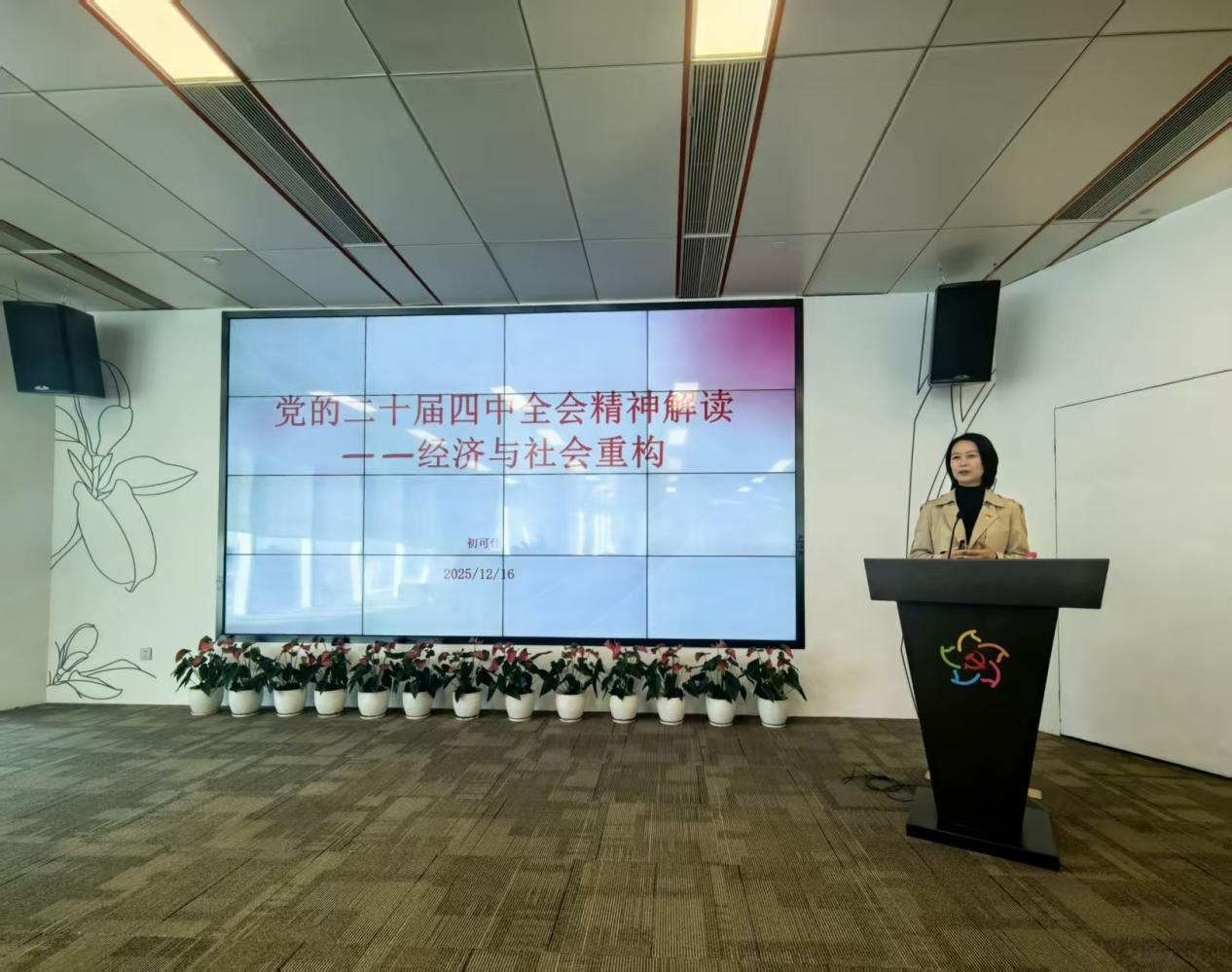 2025年12月16日上午,bevictor伟德、国际教育公司、教师发展中心、国际交流与合作处和广金诺丁汉教育合作中心等部分党员代表齐聚广州国际金融中心党群服务中心,共同聆听了一场以“党的二十届四中全会精神解读——经济与社会重构”为主题的专题党课。此次党课由公司党委委员、副董事长初可佳主讲,旨在引导党员深入领会全会精神,把握经济与社会重构的核心要义,为公司发展及国家建设贡献智慧与力量。