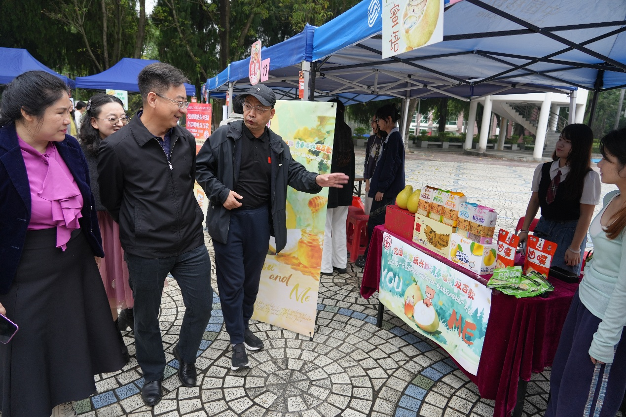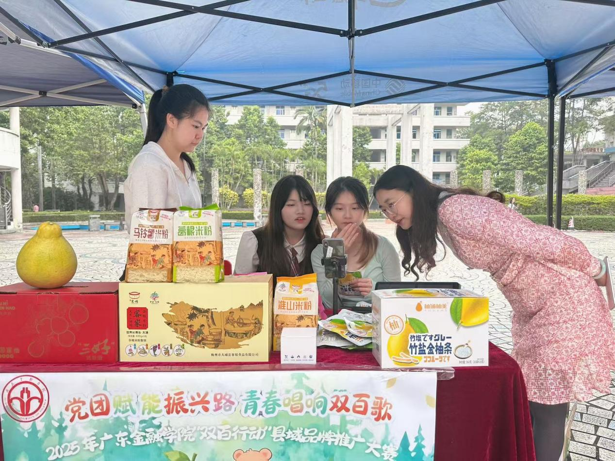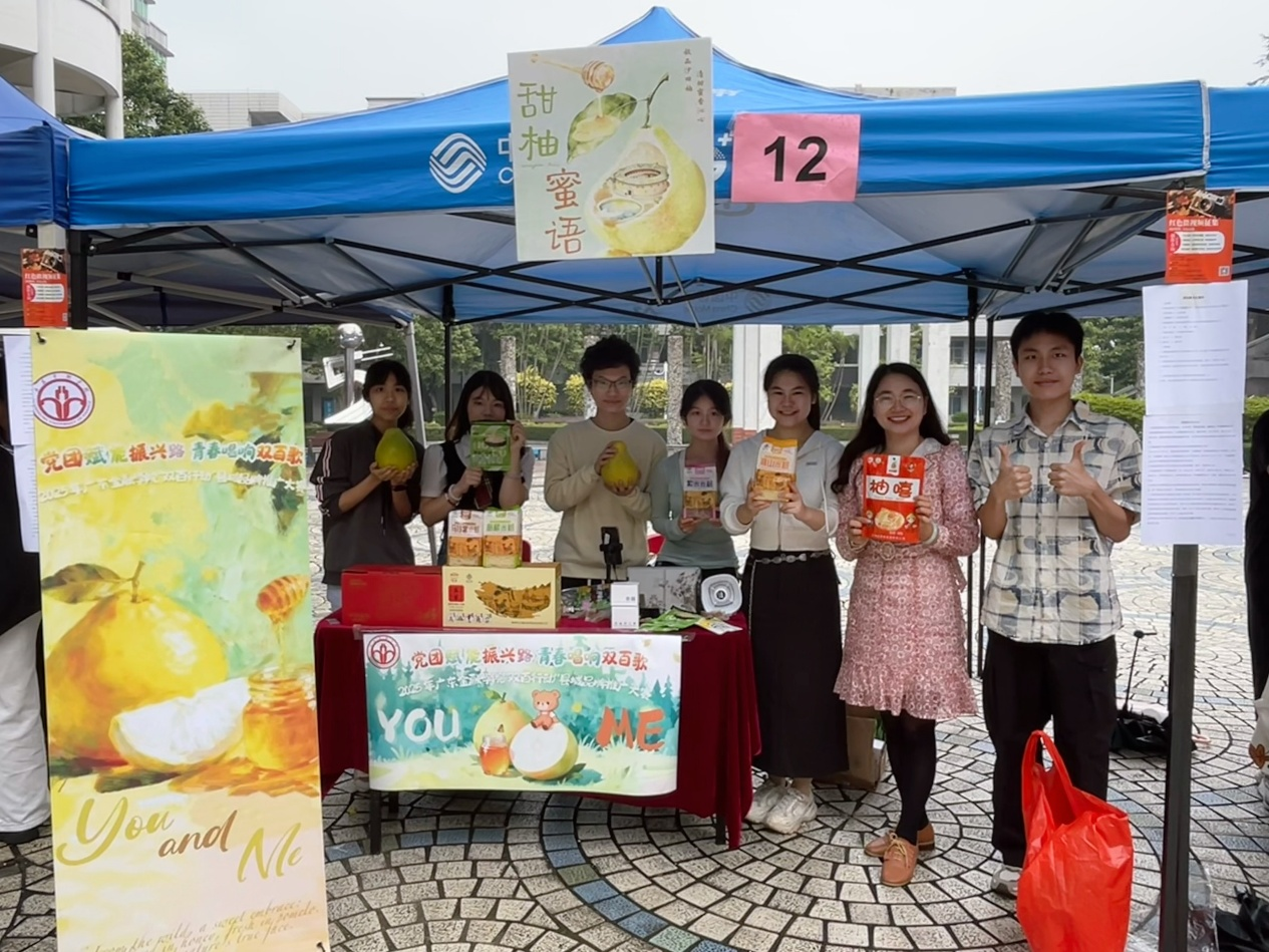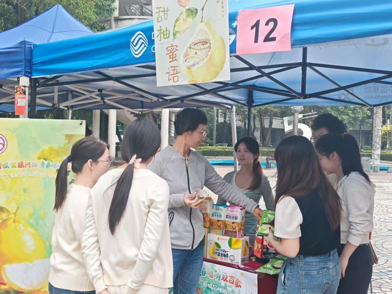 为深入贯彻国家乡村振兴战略,落实广东省“百县千镇万村高质量发展工程”与高校“双百行动”部署要求,伟德官方网站“双百行动”县域品牌推广大赛线下销售活动近日在校本部青年文化广场顺利开展。bevictor伟德积极响应,由朱冰霞老师指导的2024级英语专业员工吴滋欣、何梓杭、吴境镱、黄俊和国教院员工曾曦组成了一个跨专业团队,以“甜柚蜜语”项目为依托参加了此次活动。团队以推广“广宁优品”“大埔优品”小程序特色产品为核心,开展线上线下融合的市场营销实践,在提升员工品牌策划与创新实践能力的同时,助力梅州大埔、肇庆广宁两地产业发展与市场推广。