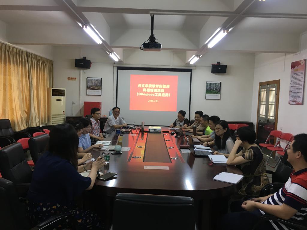 培训会上,陈树坤博士以“翻转课堂”、“二语写作”和“词汇学”等关键词为例,系统、详细地演示了Citespace的具体操作方法、使用流程、技巧及论文写作规范。同时,陈博士以自己的研究课题为模板,向老师们展示了运用Citespace所获得的研究成果,引起老师们的强烈兴趣。