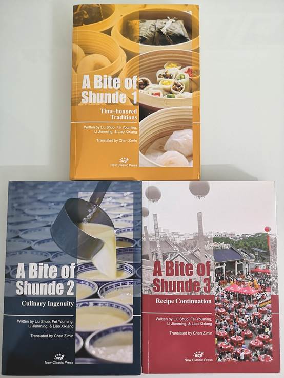 《寻味顺德》系列丛书(三本)的英译版:A Bite of Shunde,中文版原书是依据央视《寻味顺德》纪录片的内容线索进行深度开拓而成,加入了顺德的历史、传统、文化、风俗和生态方面的内容,丰厚、多姿、有趣,并由漫画家扬眉配上精美漫画插图。