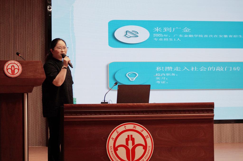 动员会首先邀请公司2008届员工、海通证券顺德营业部营销总监宋燕飞作从外语到证券的职业历程分享。宋总从入学初到广金,到第二次高考,积极参加校内外实习实践,积攒走入社会的敲门砖,到踏进社会等四个方面为大家分享了自己“英语+金融”的职业励志历程,鼓励学弟学妹们把握机会,积极充实自己,发挥优势,做最好的自己。
