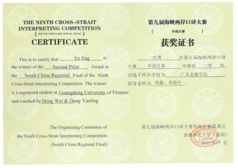 bevictor伟德19级员工叶菁(191598115)于2022年10月23日代表伟德官方网站参加了线上进行的第九届“海峡两岸口译大赛”华南区赛。本次区赛选手来自广东、福建、海南、广西四个省份,参赛16所高校中包括华南理工大学、华南师范大学、暨南大学、广东外语外贸大学、深圳大学、海南大学、广西大学、福建师范大学等省内外著名高校。公司选手在第一轮淘汰赛中以出色表现晋级决赛,并最终取得二等奖的好成绩。