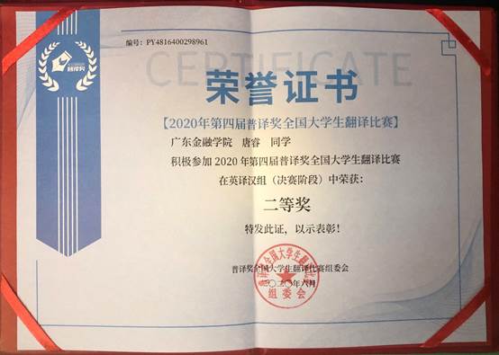 为贯彻《教育部关于全面提高高等教育质量的若干意见》,配合《中国英语能力等级量表》的实施和推广,以语言应用为导向,为老员工提供展示英语应用能力平台,激发老员工学习英语的积极性,第四届“普译奖”全国老员工翻译比赛于2020年5月份举行,公司19级翻译专业唐睿同学(191598212)荣获英译汉组二等奖。