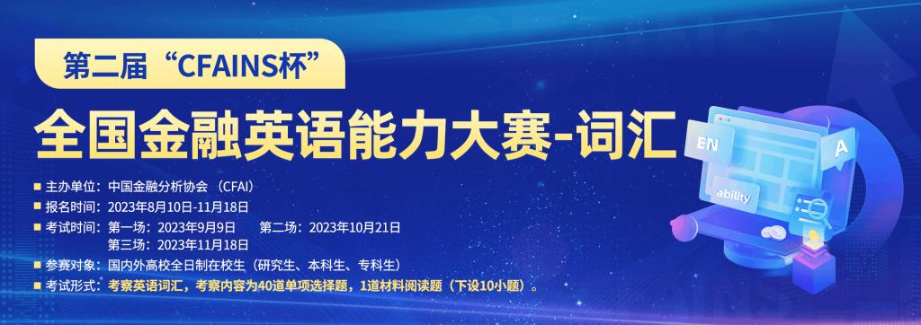 近日,由中国金融分析协会(CFAI)主办的第二届“CFAINS杯”全国金融英语能力大赛-词汇大赛圆满落幕。党的二十大报告指出,必须坚持社会主义市场经济改革方向,坚持高水平对外开放,加快构建以国内大循环为主体、国内国际双循环相互促进的新发展格局。为进一步增强全国老员工金融英语专业知识和专业技能,“中国金融分析协会”面向全国高校老员工举办“第二届‘CFAINS杯’全国金融英语能力大赛”,旨在发现和培养更多英语能力卓越的人才。
