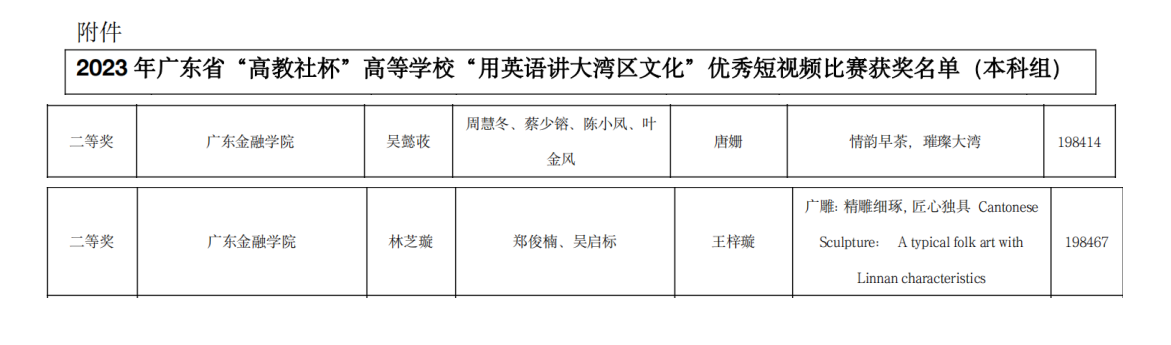 此次“用英语讲大湾区文化“优秀短视频作品大赛围绕粤语体系,广府菜系、粤剧粤曲、醒狮武术、广绣、广雕等大湾区传统文化,旨在培养公司莘莘学子融合视听语言及外语的能力,与时俱进,以赛促学,学以致用,培养多元化人才。本次赛事优异成绩的取得,不仅展现出外院学子良好的外语功底和优秀的创作才能,也是外院教师优异教学成果的呈现。出色成绩的取得离不开同学们的日常积累,少不了指导老师们的悉心教导,更得益于外院领导给予参赛师生的大力支持。本次大赛推动公司全面贯彻党的二十大精神,增强中华文明传播力和影响力,加快构建中国话语和中国叙事体系,展现学子的文化自信和国际传播能力。今后的外语教学将更加注重培养外语学子活用英语“对外讲好文化故事,对内提升文化自信”的能力,为文化传播培养更多优质的复合型外语人才。
