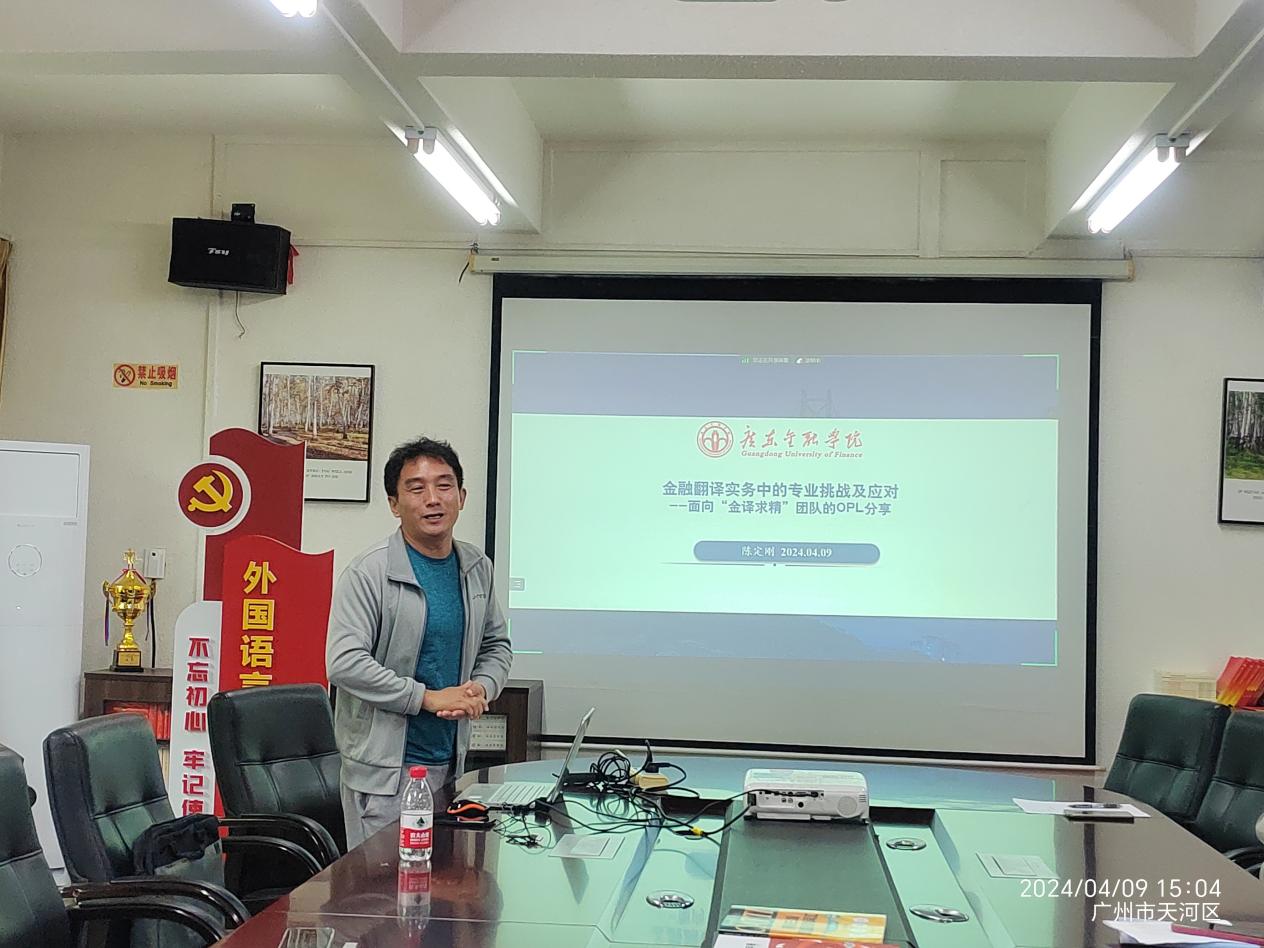 在会议的核心环节,各位嘉宾依次发言。陈树坤副经理探讨了基于语料库与人工智能的翻译研究与实践,为中心的学术研究提供了新的思路。陈定刚译审作为行业专家,分享了金融翻译实务中的专业挑战及应对策略,使同学们对实际工作中的问题有了更清晰的认识。邓燕玲老师则从口译实践的角度,介绍了常见类型及市场动态,为同学们的职业发展提供了有益的指导。