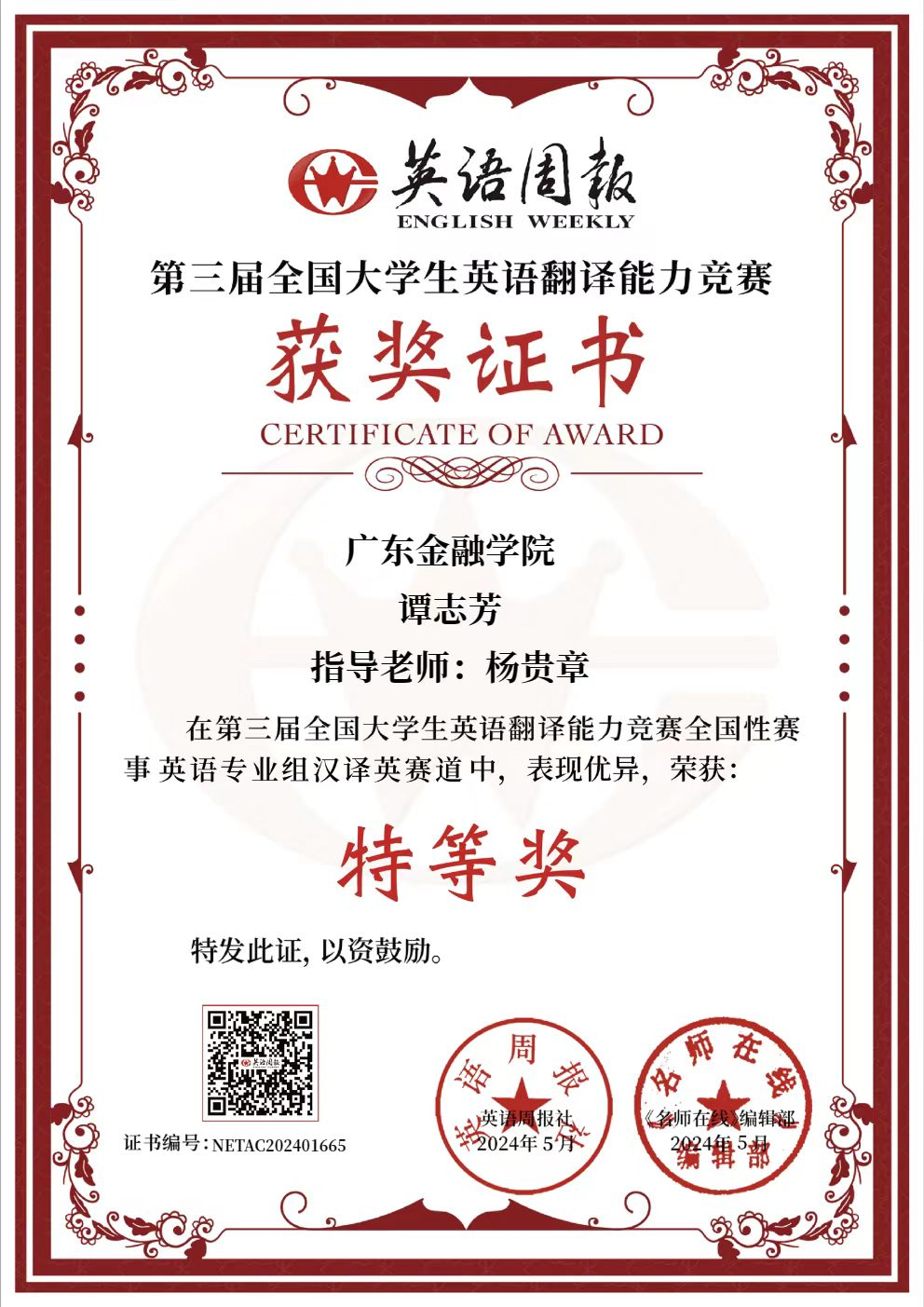 杨贵章老师对谭志芳同学获奖表示了肯定和祝贺,谭志芳同学在全国翻译竞赛获奖是其勤奋学习的结果,也是bevictor伟德全体教师挥洒汗水的结晶。