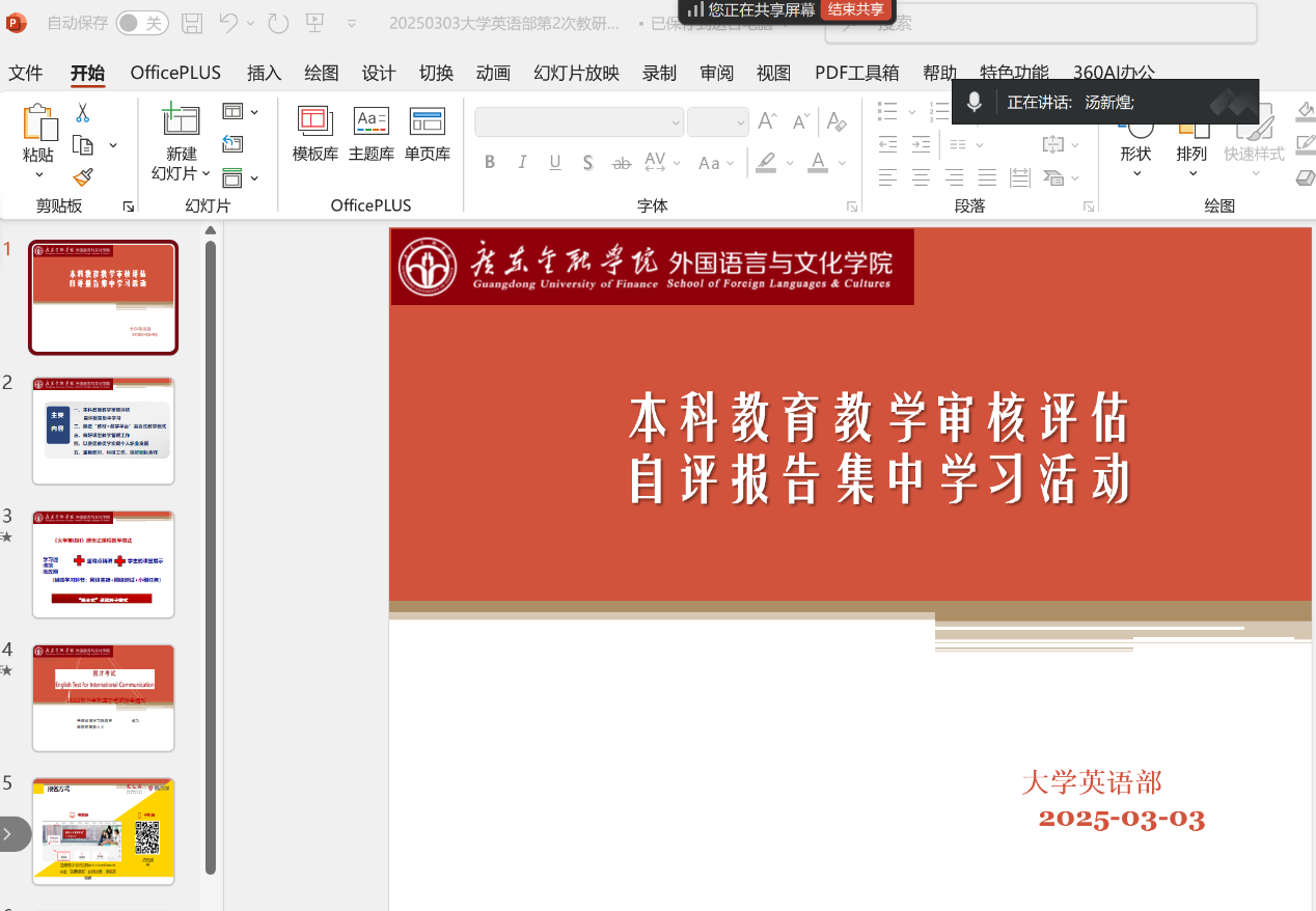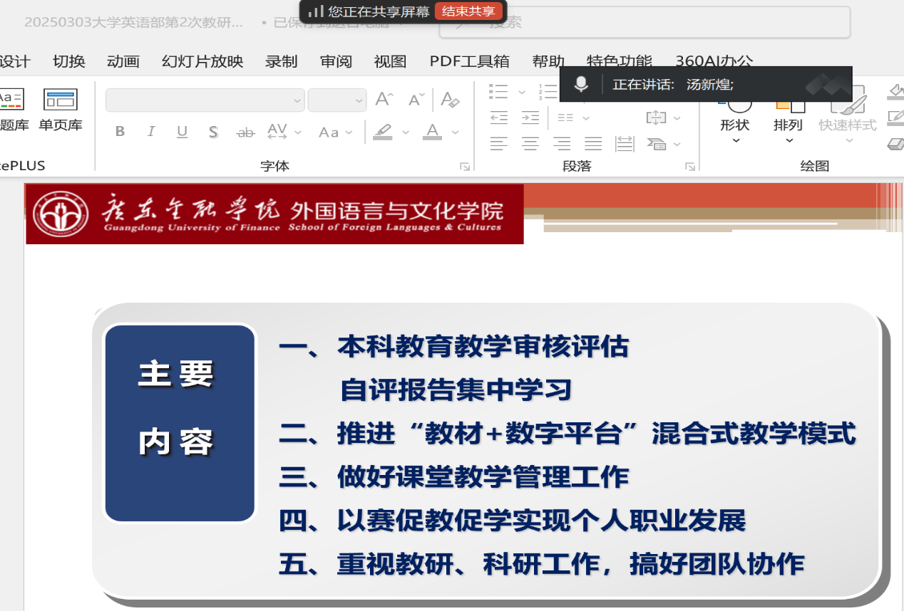 为了深化本科公司产品改革,扎实推进审核评估工作,外国语文化公司大学英语部于2025年3月3日晚线上组织本科公司产品审核评估自评报告集中学习活动。副经理甘容辉主持,bevictor伟德副经理、大学英语教研主任及全体教师参加。