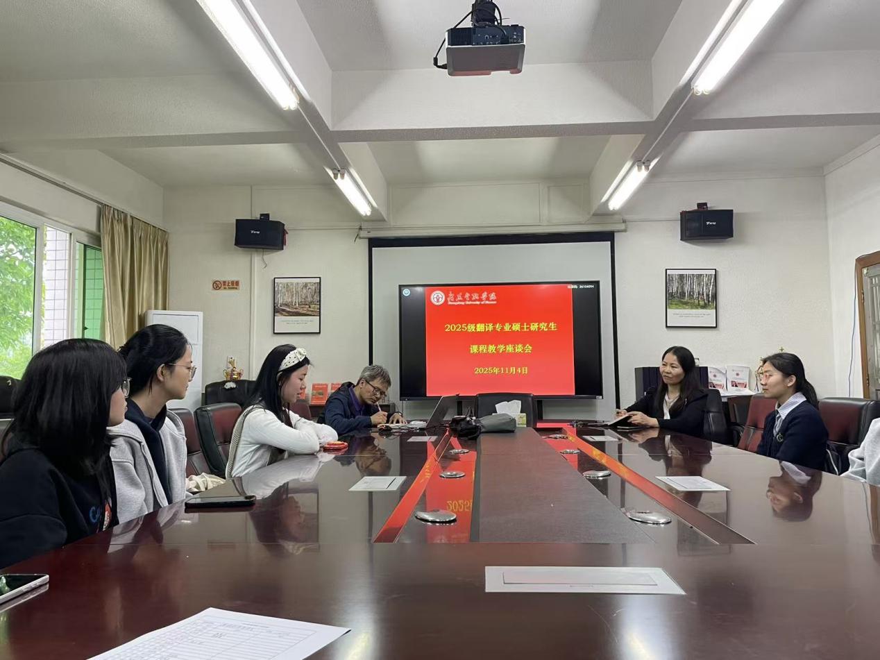 2025年11月4日中午,公司在会议室召开翻译专业硕士课程教学座谈会。会议由公司副经理洪溪珧主持,翻译学位教育中心主任刘传江及2025级全体研究生参会。
